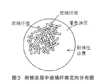 該高耐候性彩色水泥瓦制作流程是將以水泥為主要成分的坯料擠壓成坯,瓦體養(yǎng)護(hù)硬化,涂以涂料,修平整,形成底層涂膜層。為了防止瓦中堿分對上層涂膜層的侵蝕,可在底涂膜層上,涂以耐堿性涂料,形成耐堿涂膜層,然后涂以著色涂料,形成裝飾涂膜層,最后涂以耐候涂料,形成耐候涂膜層(見圖1和圖2)。著色涂層由含有所需著色顏料的水性丙烯酸涂料構(gòu)成,其厚度約為100μm。耐候性涂層由與著色層相同的水性丙烯酸涂料與耐候性纖維(添加量為7%~12%)組成的涂料構(gòu)成,其厚度約為 25μm。耐候性涂料用噴槍高壓噴涂在瓦著色裝飾涂層上。耐候性涂料涂覆在著色涂層上時,玻璃纖維以平躺姿態(tài),水平方向無序隨機(jī)定向分布(見圖 3)。對瓦涂以耐候性涂料后,為了固定玻璃纖維,約在100℃下充分干燥。